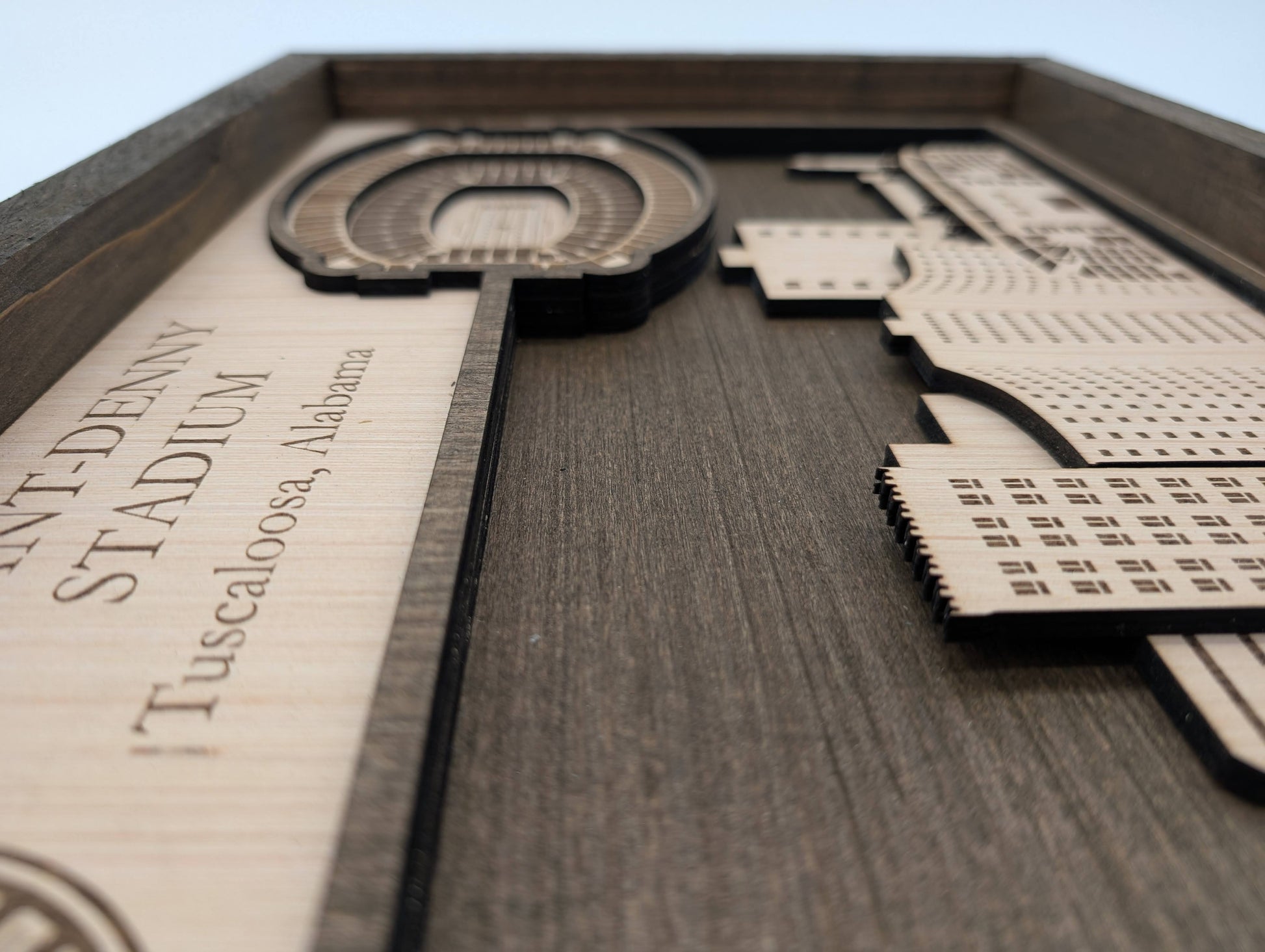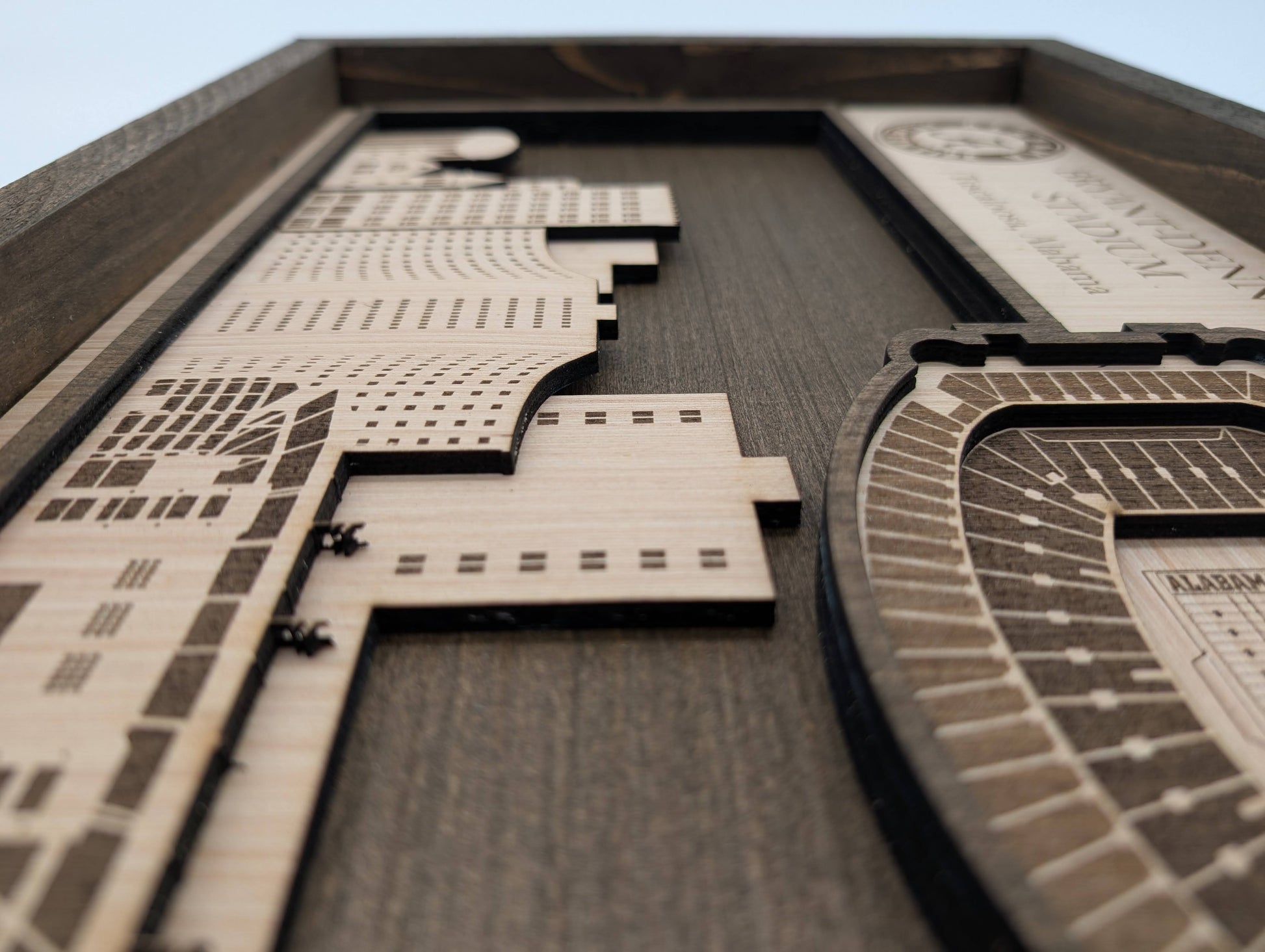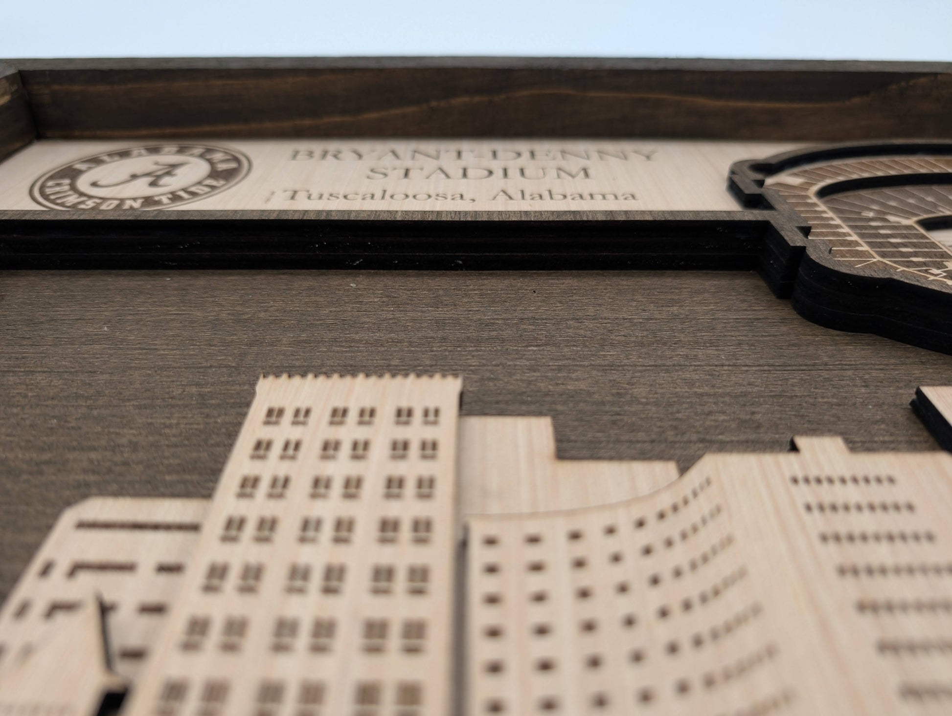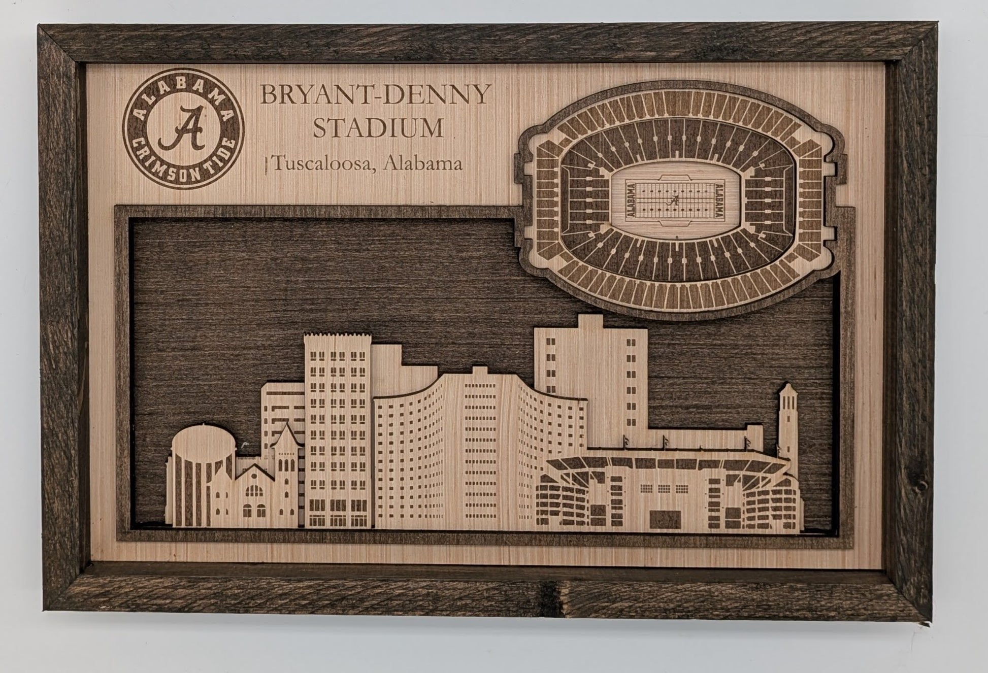 This handcrafted 3D layered wood art captures the iconic Bryant-Denny Stadium with remarkable detail and depth. Each piece is made from solid wood and assembled by hand, creating a striking dimensional effect that brings the legendary Alabama football venue to life. The natural wood grain adds warmth and authenticity to this unique wall decor. Perfect for devoted Crimson Tide fans. A sophisticated statement piece that celebrates one of college football's most storied stadiums.