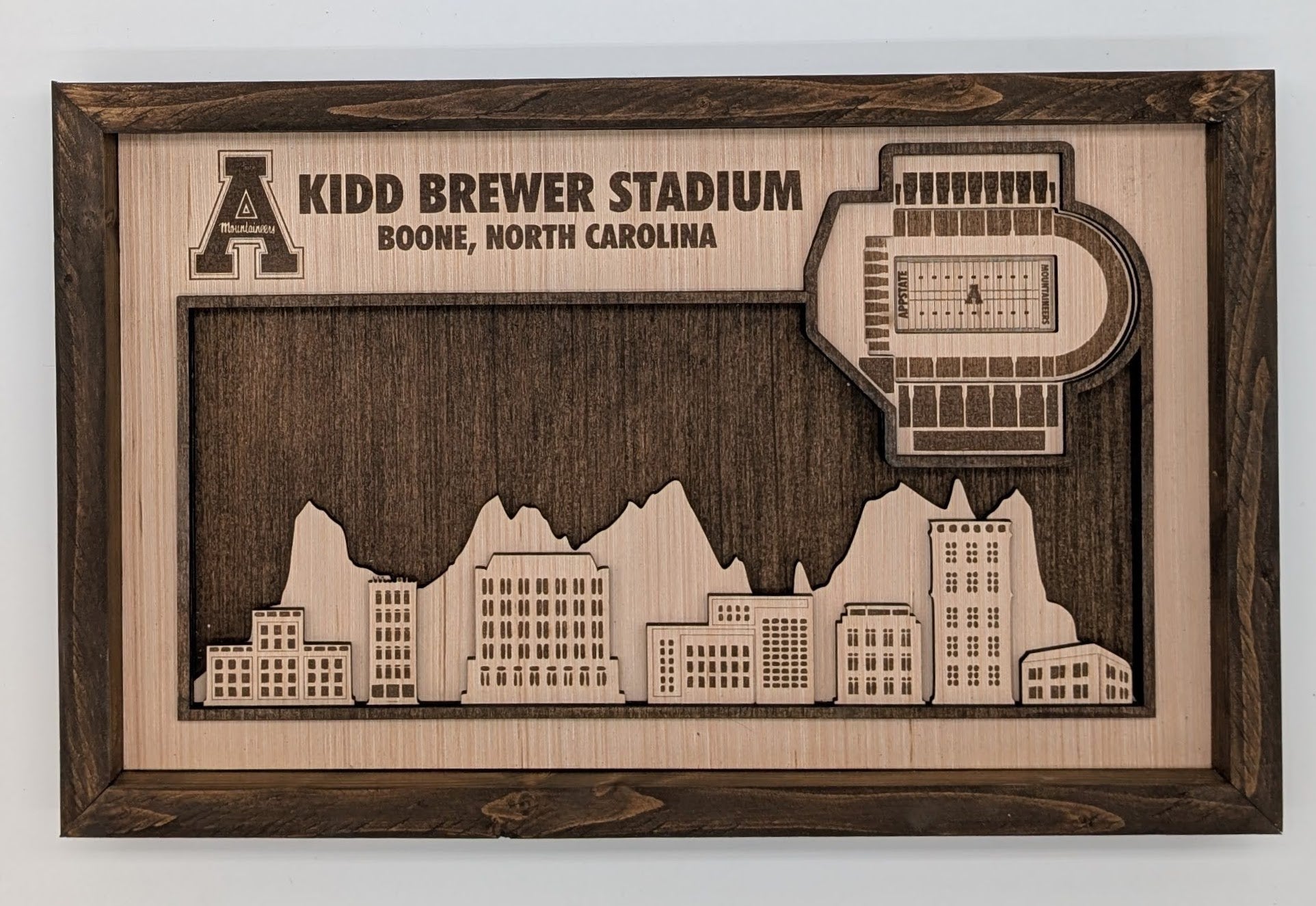This handcrafted 3D layered wood art captures the iconic Kidd Brewer Stadium with remarkable detail and depth. Each piece is made from solid wood and assembled by hand, creating a striking dimensional effect that brings the legendary Appalachian State football venue to life. The natural wood grain adds warmth and authenticity to this unique wall decor. Perfect for devoted Mountaineers fans. A sophisticated statement piece that celebrates one of college football's most beautiful stadiums.