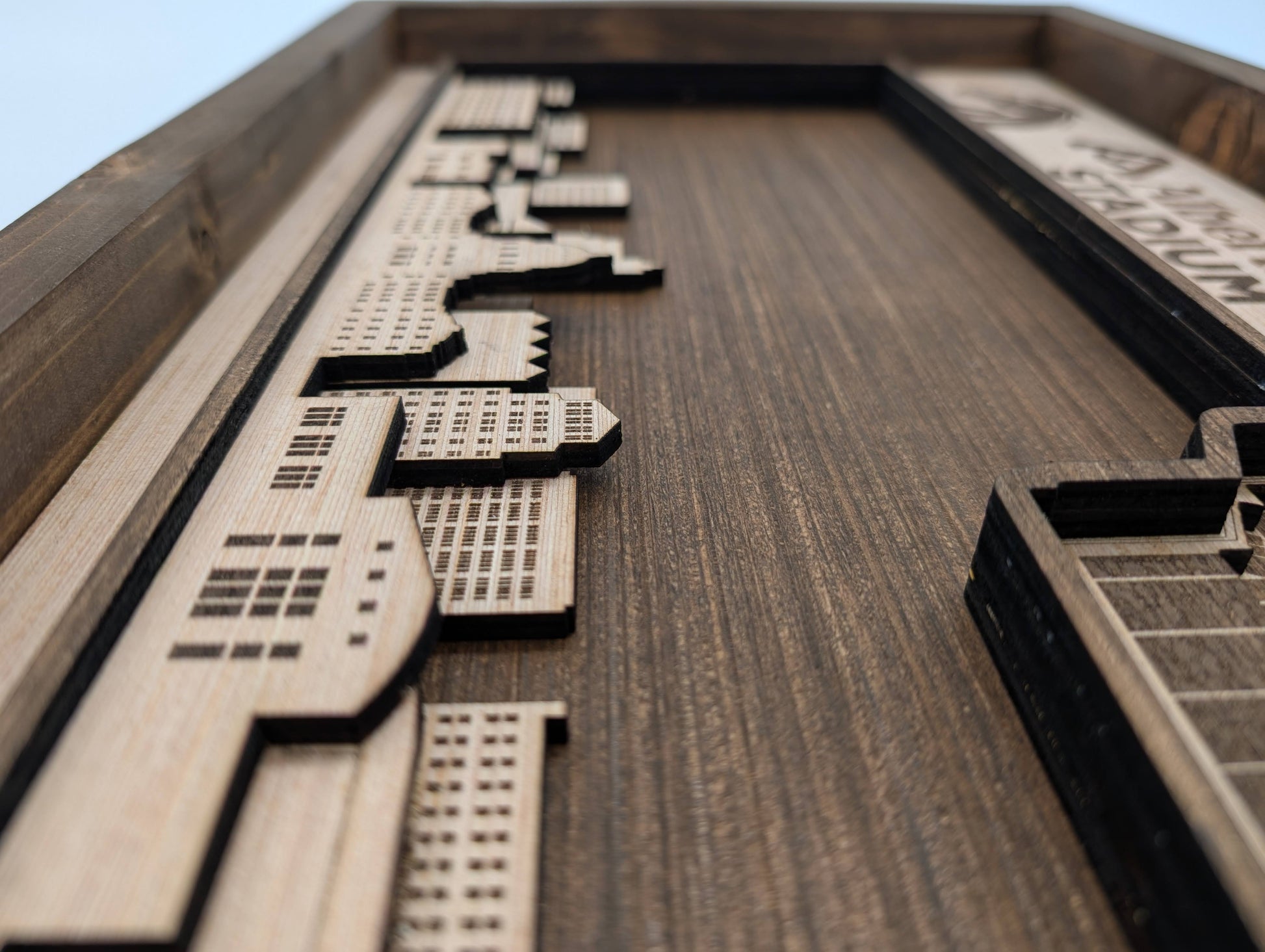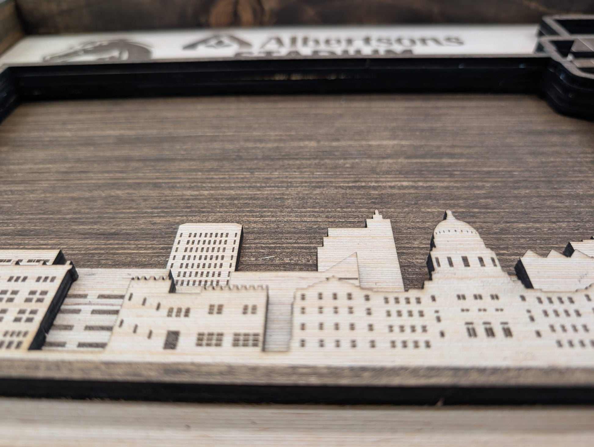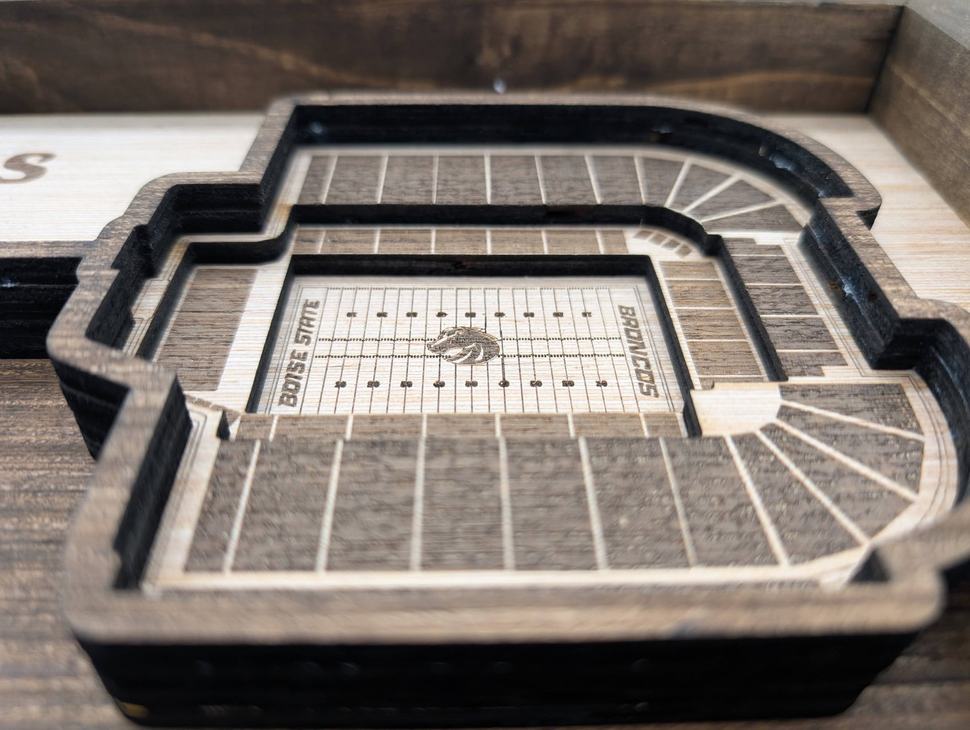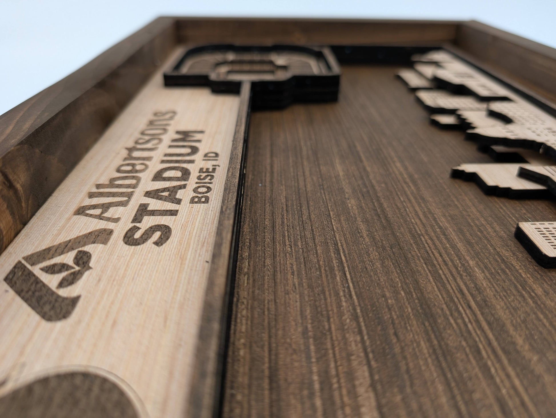This handcrafted 3D layered wood art captures the iconic Albertsons Stadium with remarkable detail and depth. Each piece is made from solid wood and assembled by hand, creating a striking dimensional effect that brings the legendary Boise State football venue to life. The natural wood grain adds warmth and authenticity to this unique wall decor. Perfect for devoted Broncos fans. A sophisticated statement piece that celebrates one of college football's most beautiful stadiums.