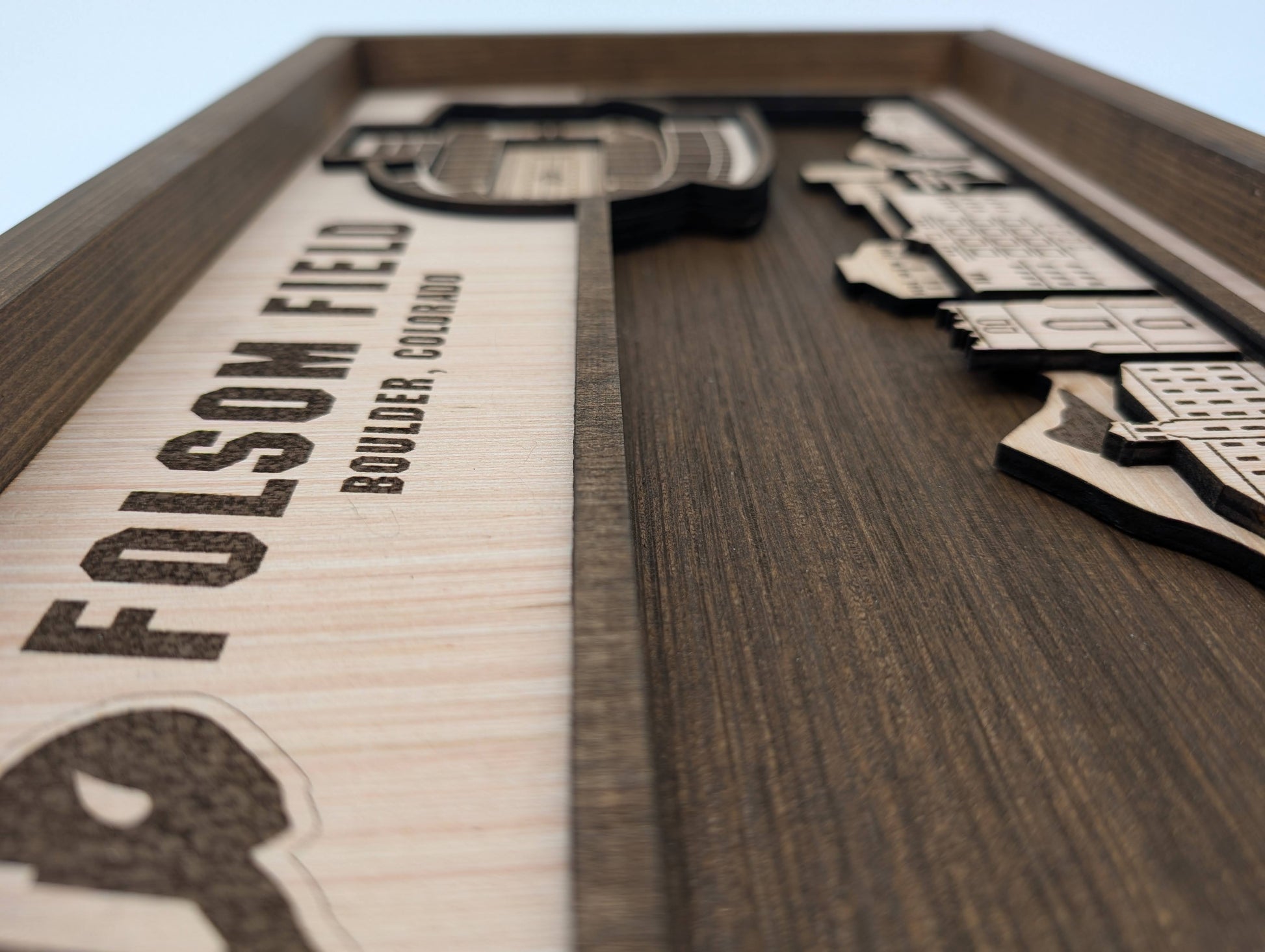 This handcrafted 3D layered wood art captures the iconic Folsom Stadium with remarkable detail and depth. Each piece is made from solid wood and assembled by hand, creating a striking dimensional effect that brings the legendary Colorado football venue to life. The natural wood grain adds warmth and authenticity to this unique wall decor. Perfect for devoted Buffaloes fans. A sophisticated statement piece that celebrates one of college football's most storied stadiums.