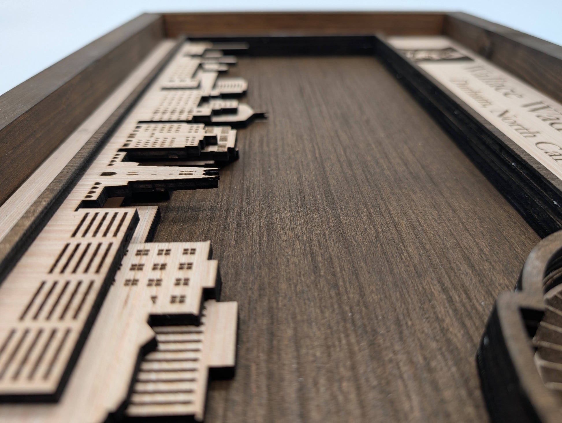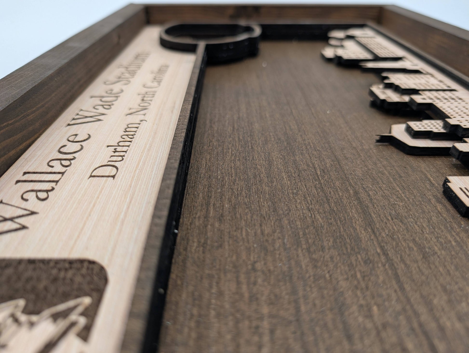 This handcrafted 3D layered wood art captures Wallace Wade Stadium with remarkable detail and depth. Each piece is made from solid wood and assembled by hand, creating a striking dimensional effect that brings the Duke football venue to life. The natural wood grain adds warmth and authenticity to this unique wall decor. Perfect for devoted Blue Devils fans. A sophisticated statement piece that celebrates one of college football's stadiums.