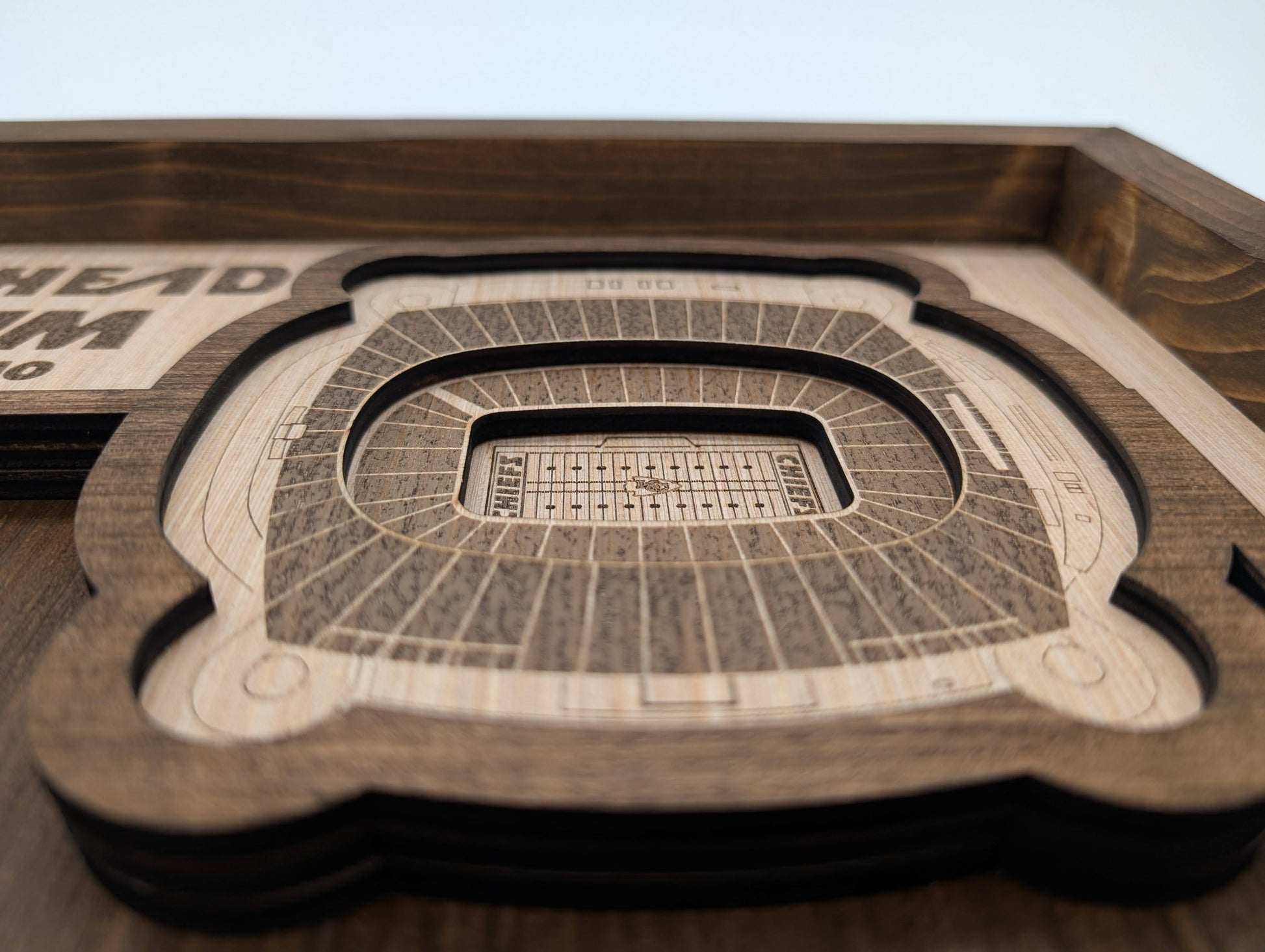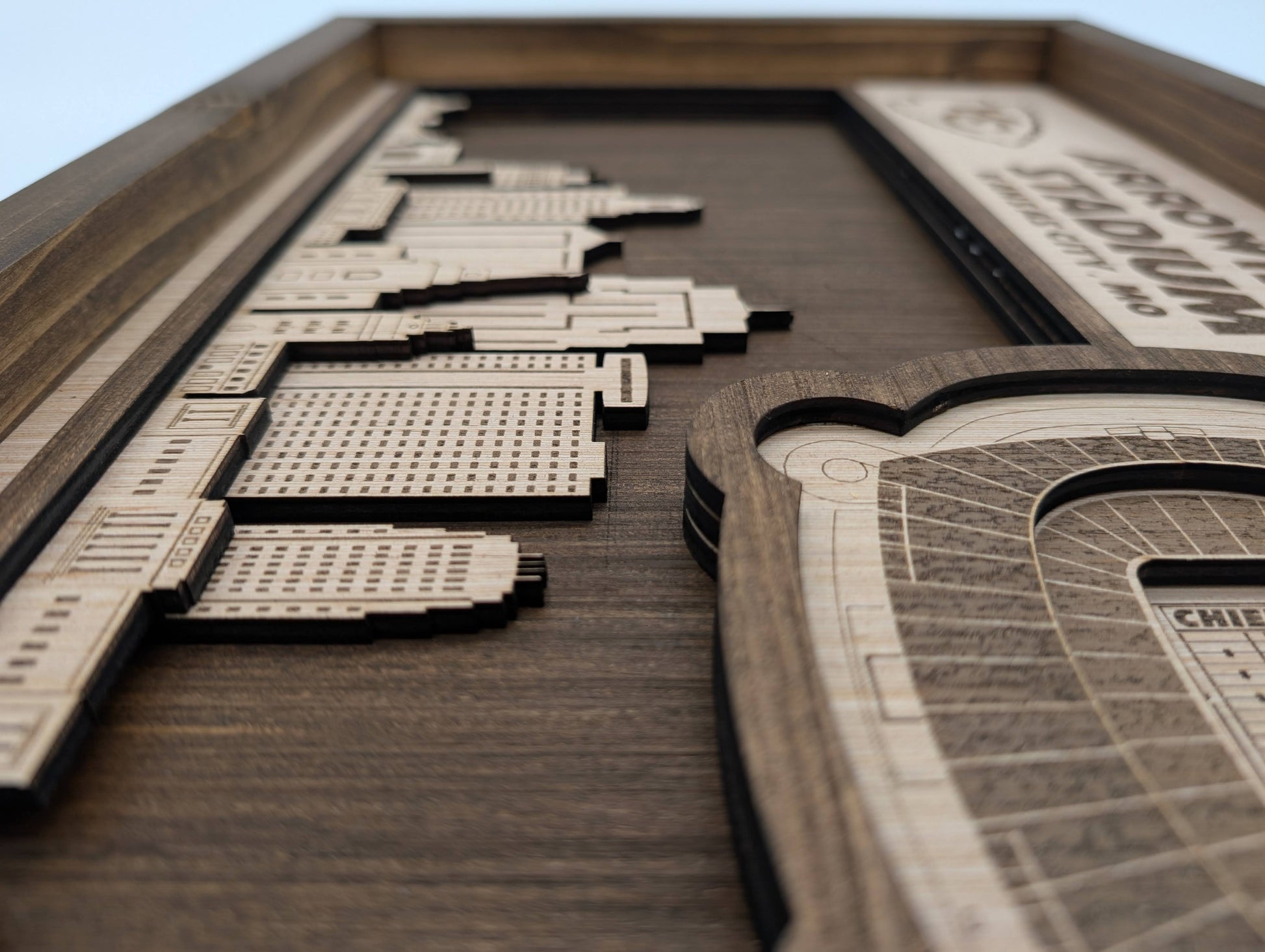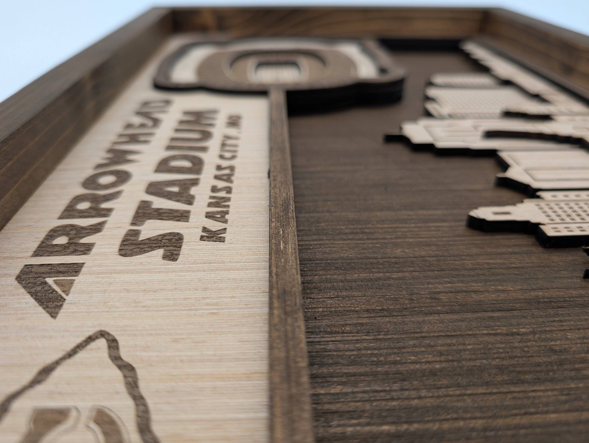 This handcrafted 3D layered wood art captures the iconic Arrowhead Stadium with remarkable detail and depth. Each piece is made from solid wood and assembled by hand, creating a striking dimensional effect that brings the legendary Kansas City football venue to life. The natural wood grain adds warmth and authenticity to this unique wall decor. Perfect for devoted Chiefs fans. A sophisticated statement piece that celebrates one of professional football's most storied stadiums.