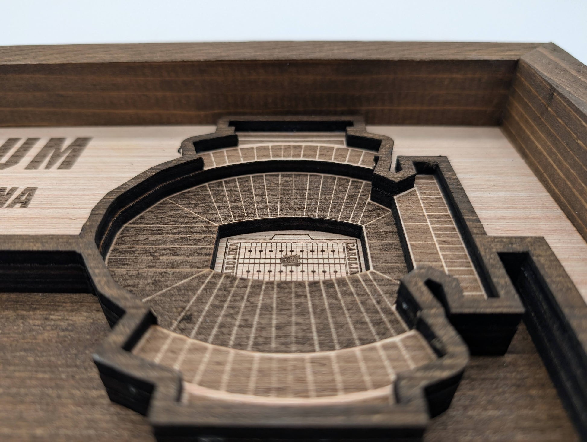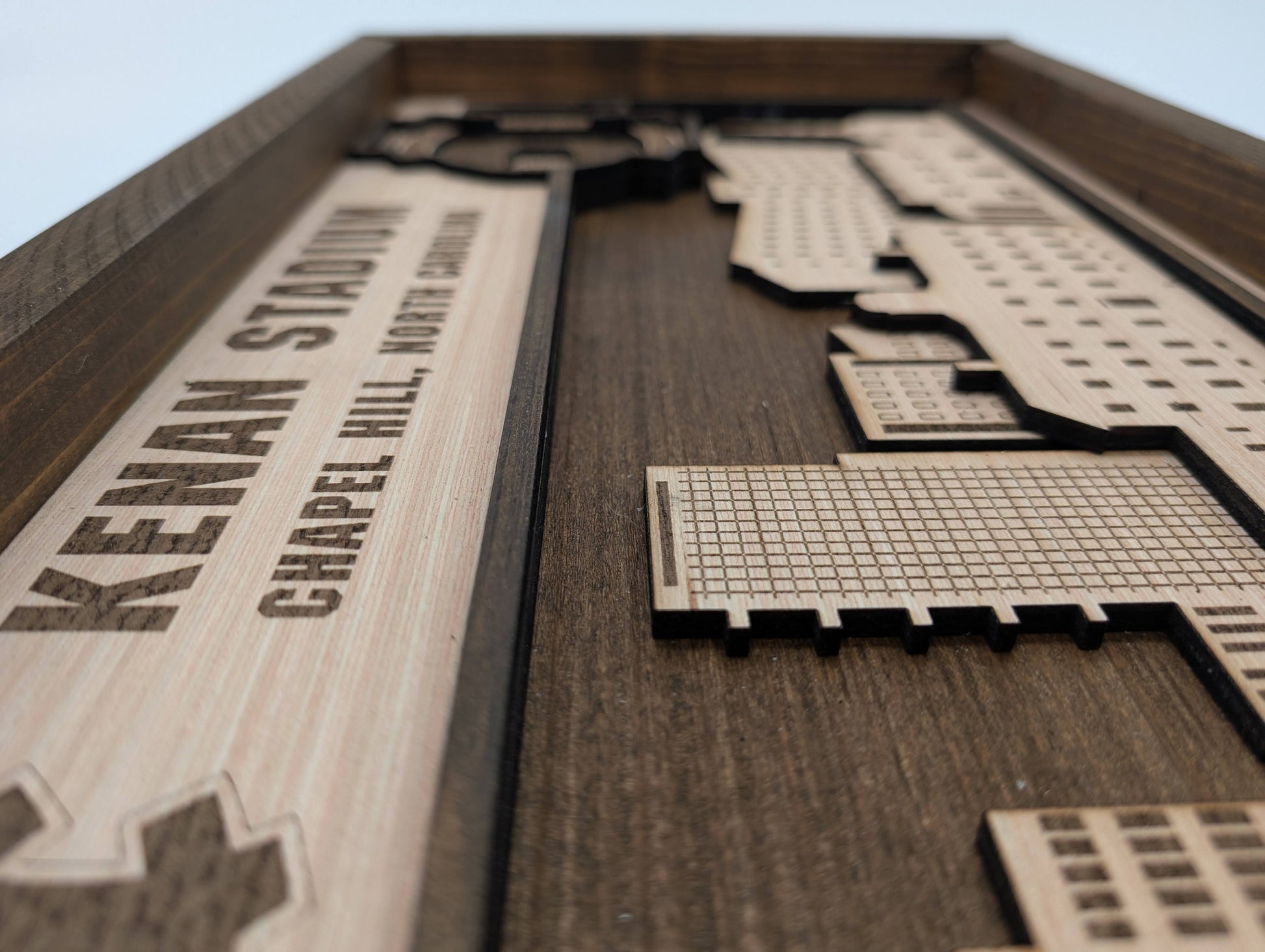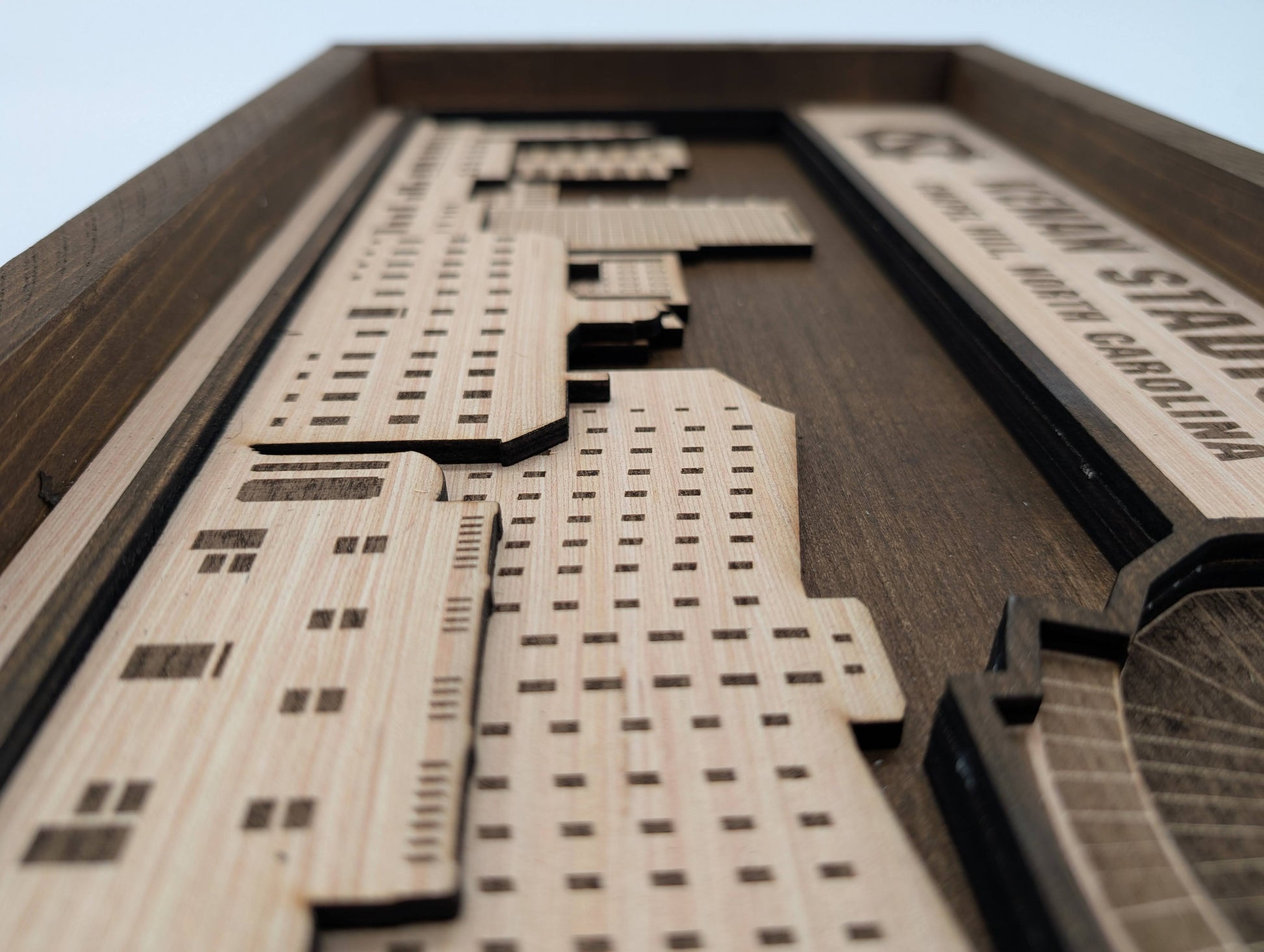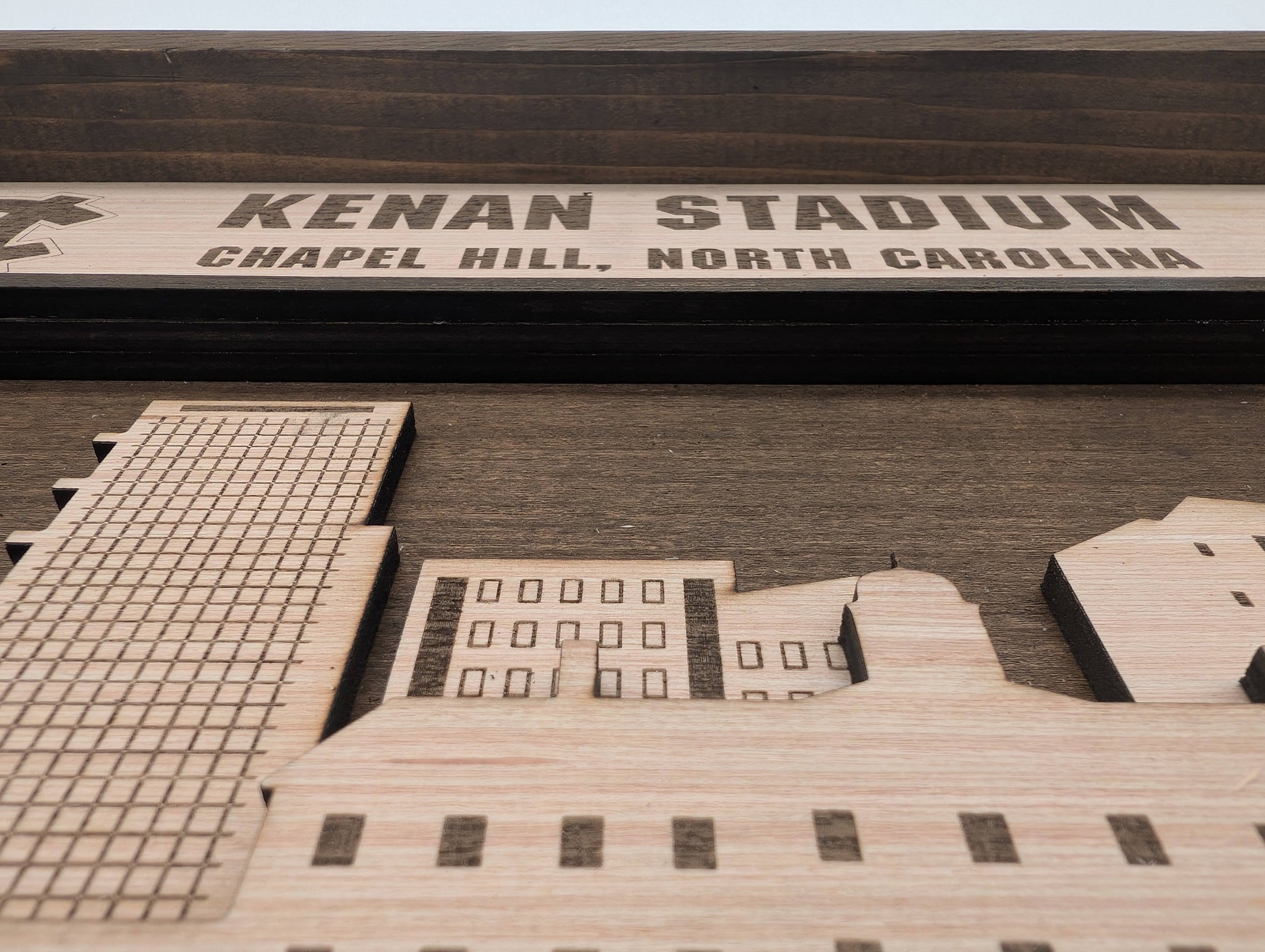 This handcrafted 3D layered wood art captures the iconic Kenan Stadium with remarkable detail and depth. Each piece is made from solid wood and assembled by hand, creating a striking dimensional effect that brings the legendary North Carolina football venue to life. The natural wood grain adds warmth and authenticity to this unique wall decor. Perfect for devoted Tarheels fans. A sophisticated statement piece that celebrates one of college football's most storied stadiums.