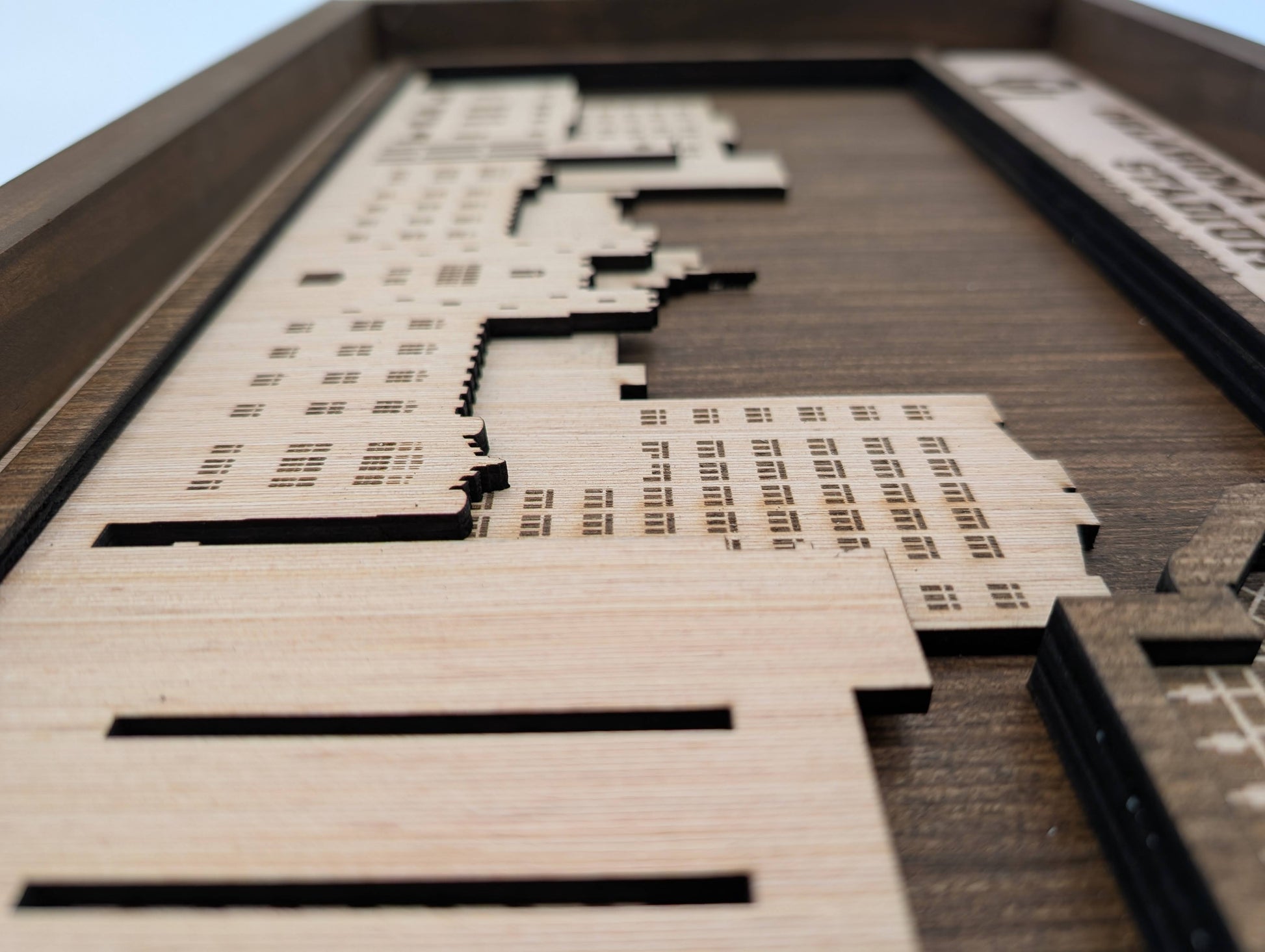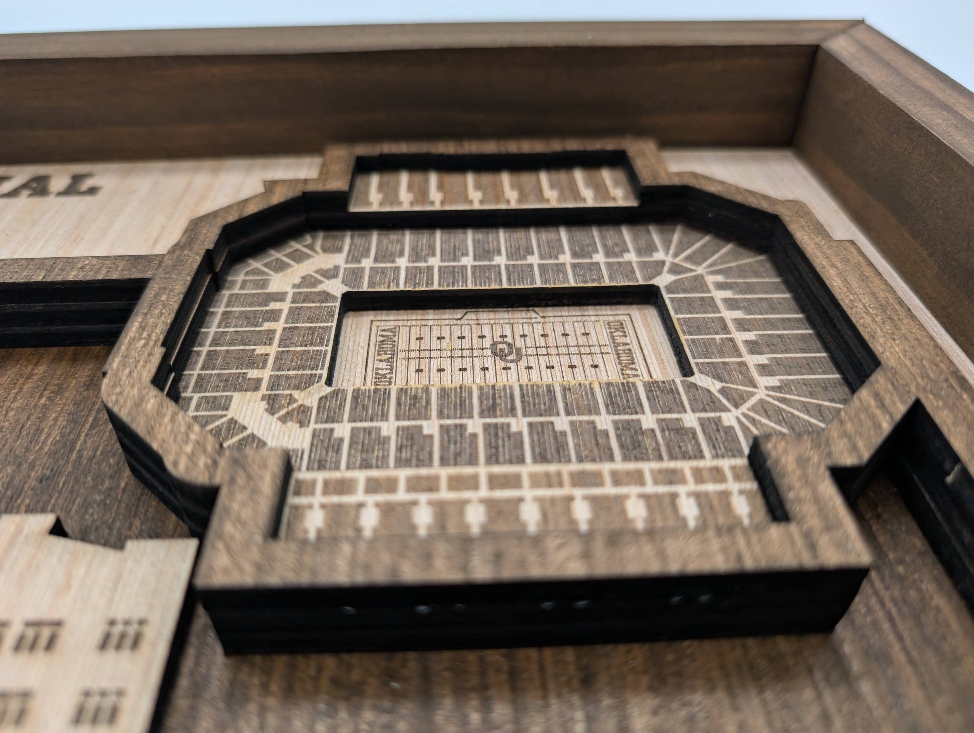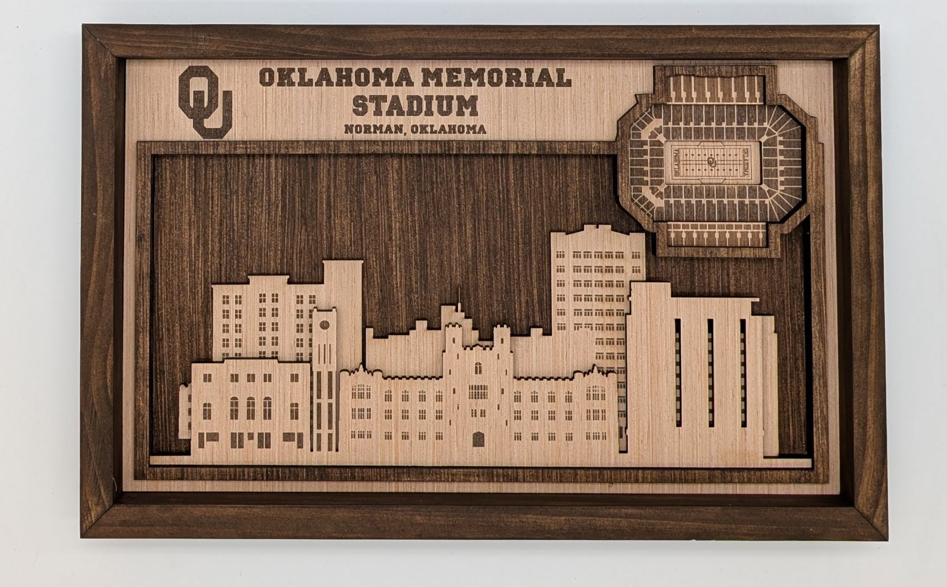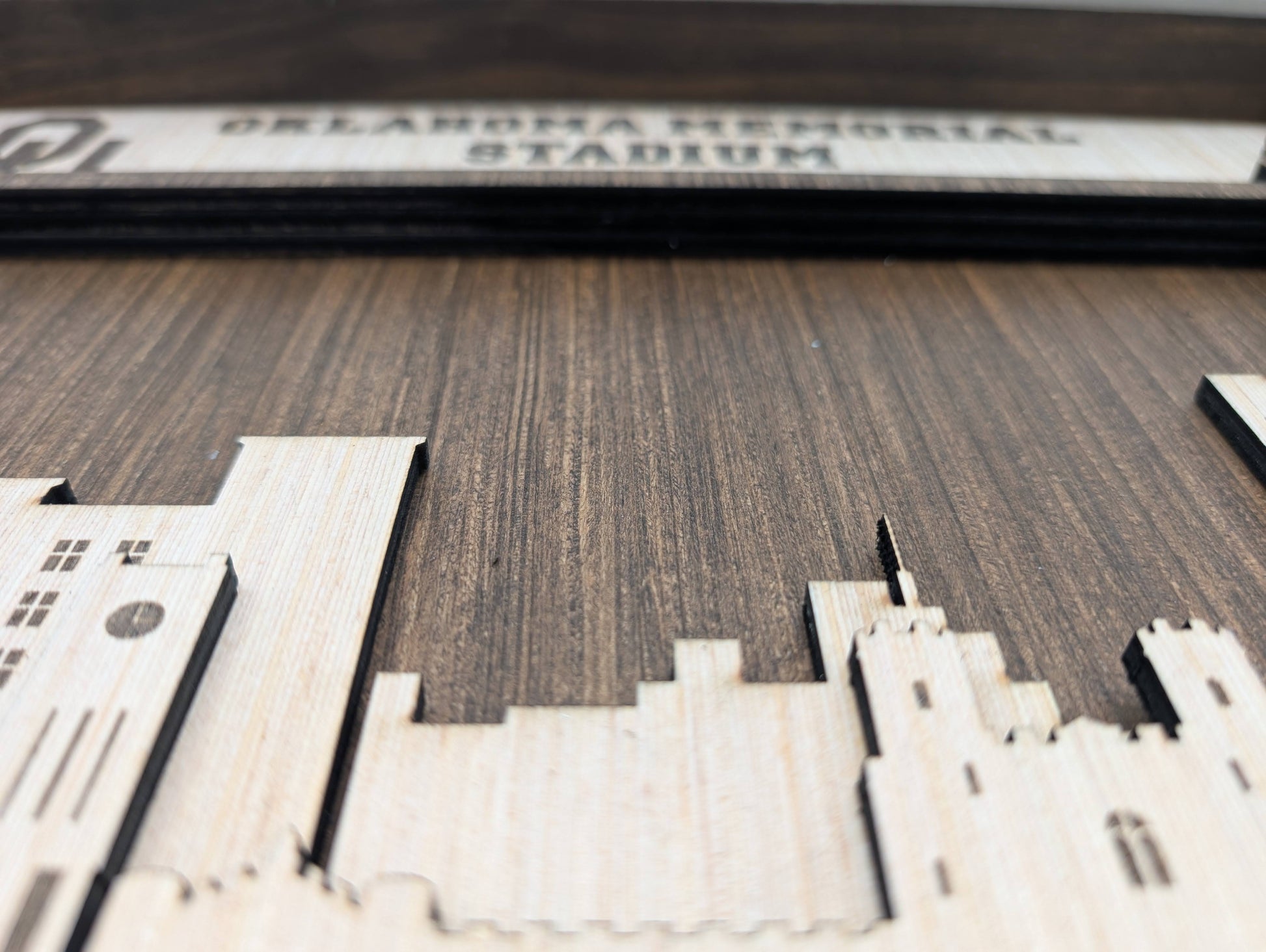 This handcrafted 3D layered wood art captures the iconic Oklahoma Memorial Stadium with remarkable detail and depth. Each piece is made from solid wood and assembled by hand, creating a striking dimensional effect that brings the legendary Oklahoma football venue to life. The natural wood grain adds warmth and authenticity to this unique wall decor. Perfect for devoted Sooners fans. A sophisticated statement piece that celebrates one of college football's most storied stadiums.