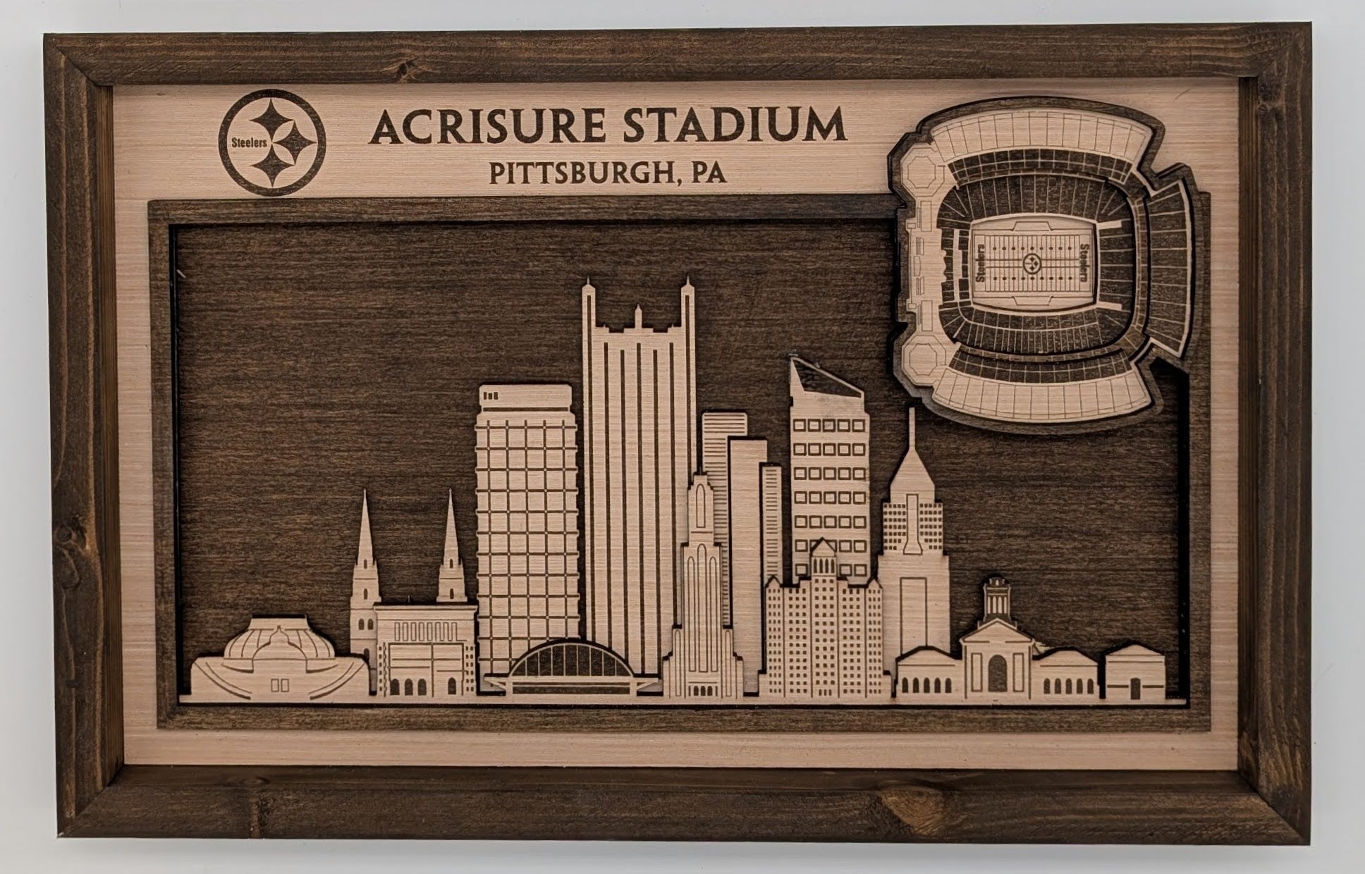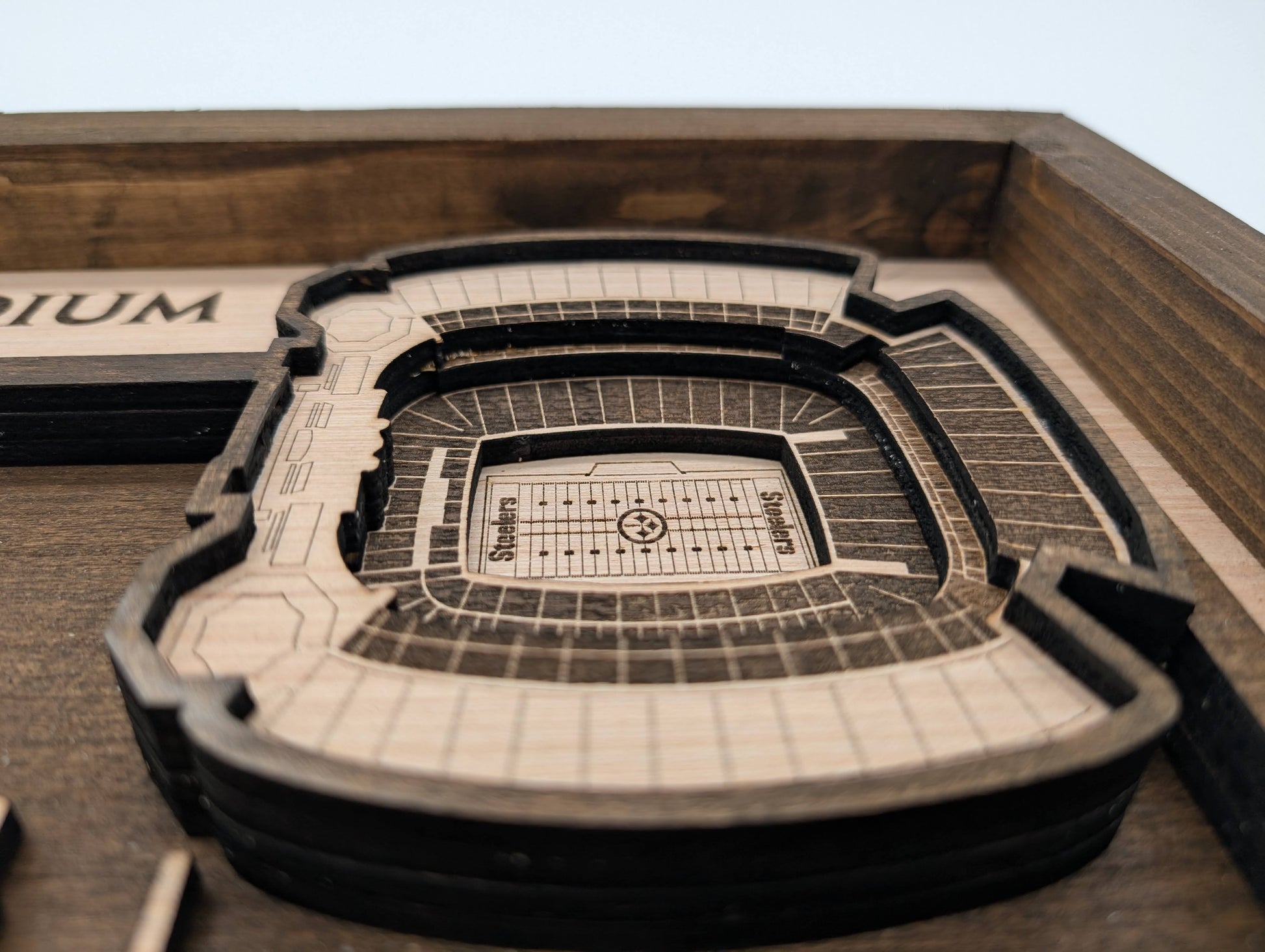 This handcrafted 3D layered wood art captures the iconic Acrisure Field with remarkable detail and depth. Each piece is made from solid wood and assembled by hand, creating a striking dimensional effect that brings the legendary Pittsburgh football venue to life. The natural wood grain adds warmth and authenticity to this unique wall decor. Perfect for devoted Steelers fans. A sophisticated statement piece that celebrates one of professional football's most storied stadiums.