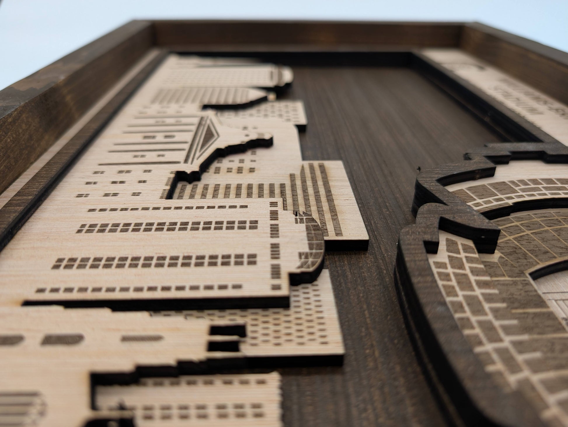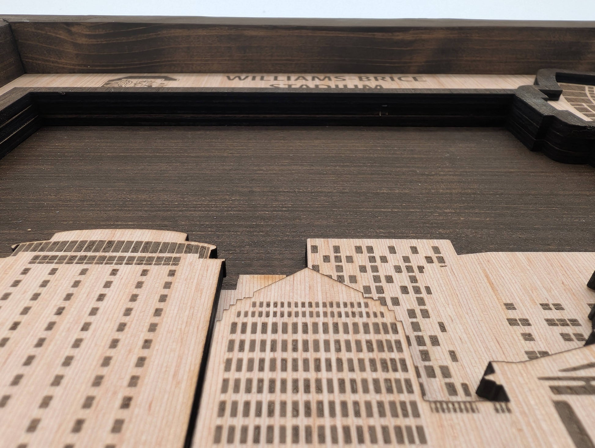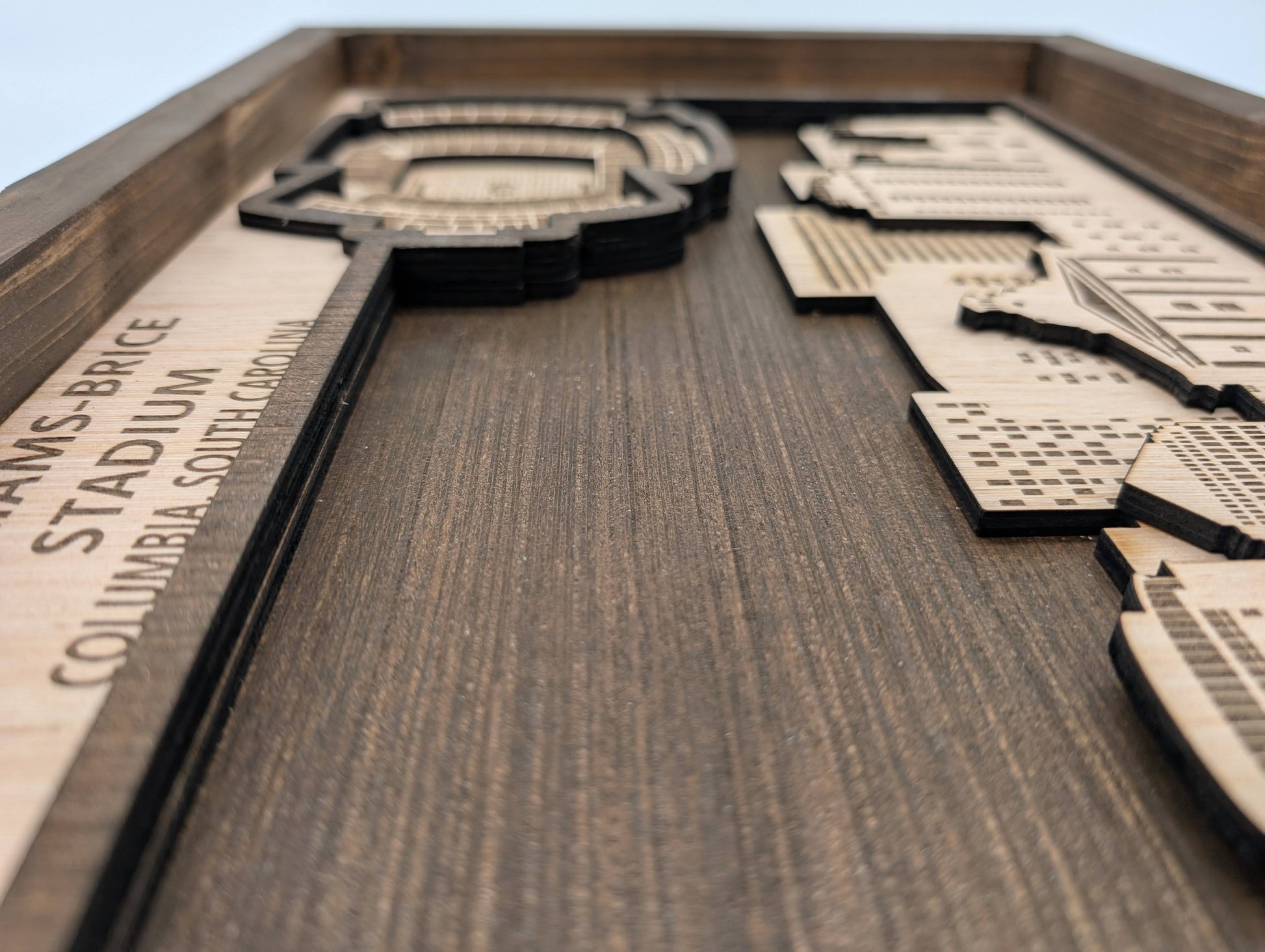 This handcrafted 3D layered wood art captures the iconic Williams-Brice Stadium with remarkable detail and depth. Each piece is made from solid wood and assembled by hand, creating a striking dimensional effect that brings the legendary South Carolina football venue to life. The natural wood grain adds warmth and authenticity to this unique wall decor. Perfect for devoted Gamecocks fans. A sophisticated statement piece that celebrates one of college football's most storied stadiums.
