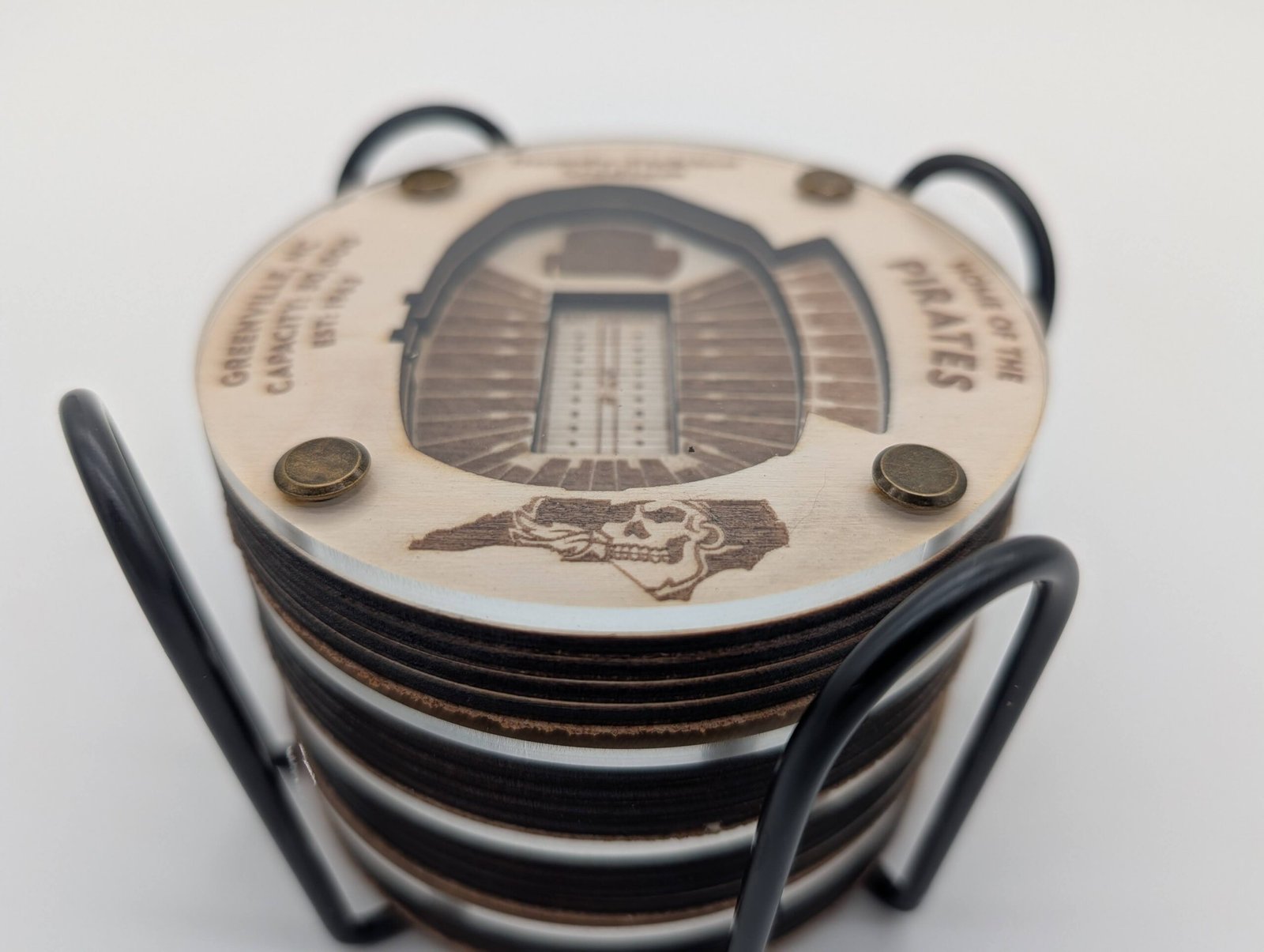Celebrate the legendary home of East Carolina Pirates football with this stunning 3D layered coaster set.